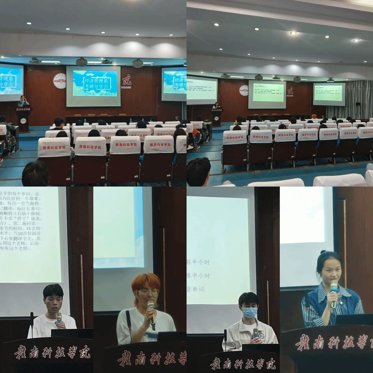 本网讯:为帮助同学们了解当前考研形势,确立合理的考研目标,进一步提高考研的复习效率。5月12日晚,经济管理系在新民楼学术报告厅开展考研交流分享会。此次交流会邀请了2023届五名优秀的拟录取研究生学子与同学们分享考研经验和心得,经济管理系意向考研同学100余人参加了活动。