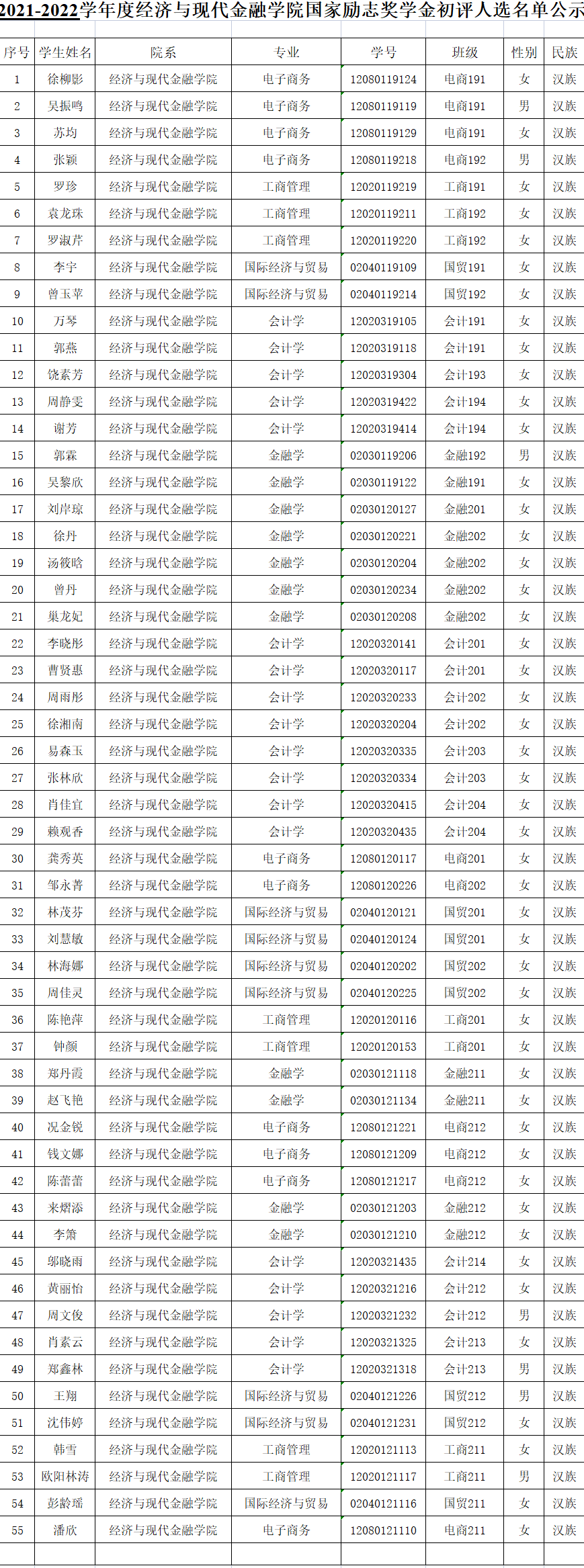 根据《赣南科技学院本科生国家励志奖学金评审实施办法》及学工《关于开展我校国家励志奖学金评定工作的通知》(〔2022〕25号)等有关文件精神,经学生个人申请、班级评议小组评议、系评审领导小组初审,已确定我院2021-2022学年度国家励志奖学金初评人选,现将名单予以公示。