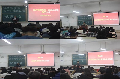 本网讯:10月22日下午,经济管理系在主教Z1D4召开了第十九届运动会动员大会。经济管理系副主任梁文学、团总支书记王博文出席了大会,全体学生干部及参赛运动员参加了会议。