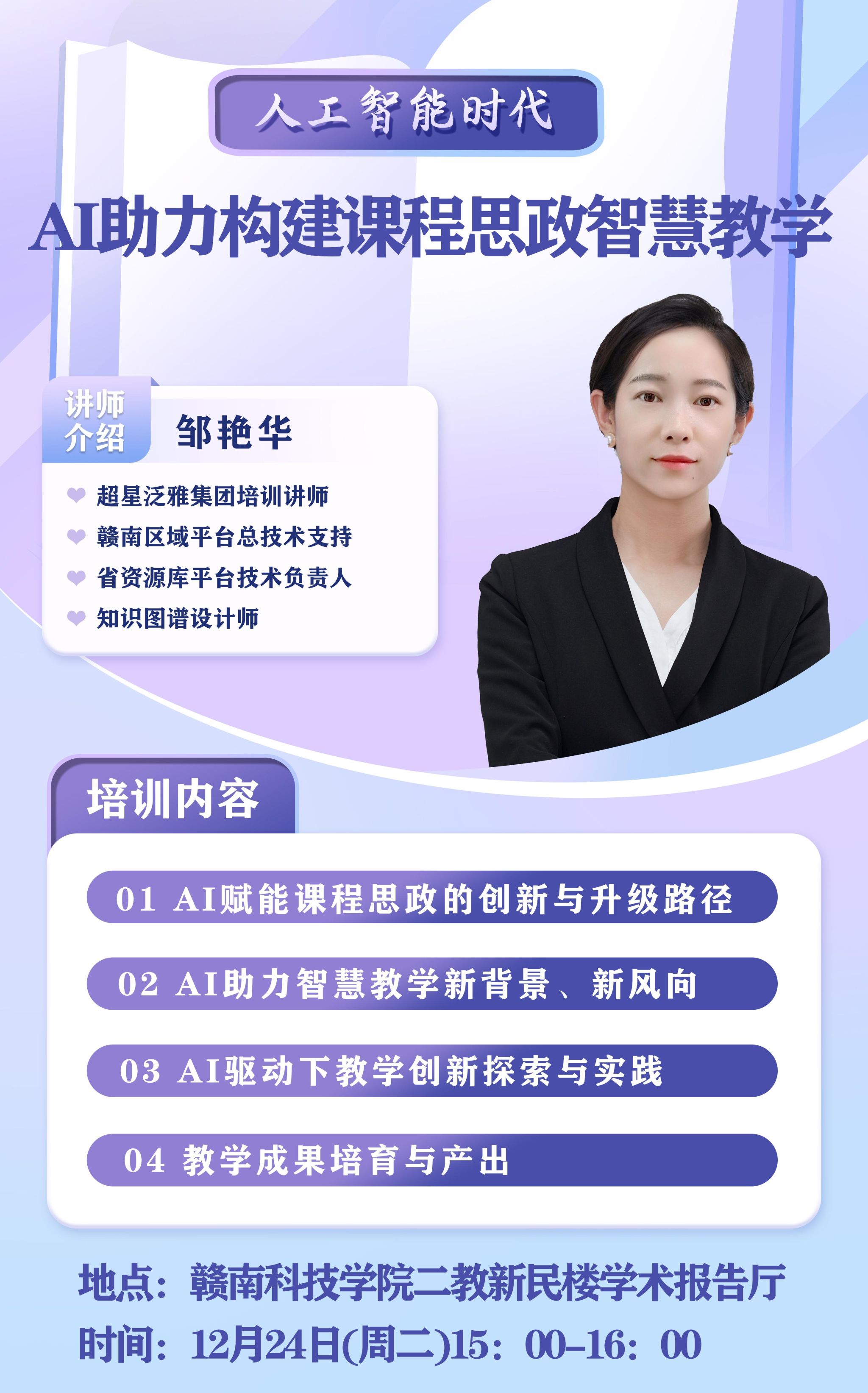 本网讯:在数字化转型浪潮席卷全球的今天,国产精品❌❌❌蜜桃丝袜紧跟时代步伐,于12月24日在新民楼302教室举办一场题为“人工智能时代AI助力构建课程思政智慧教学”专题讲座。讲座邀请超星集团邹艳华老师担任主讲嘉宾,学院全体教职工参加讲座。