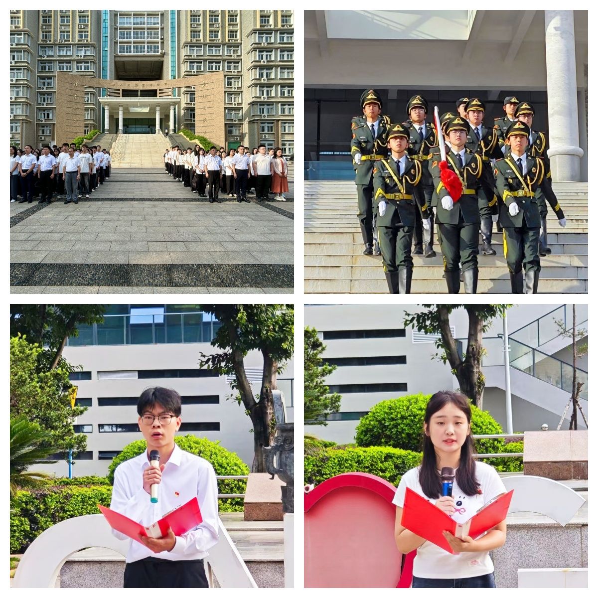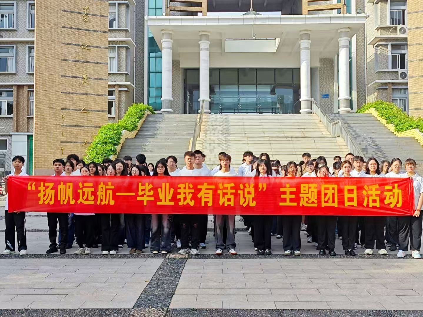 活动伊始,国旗护卫队护送国旗入场,在庄严的国歌声中,五星红旗冉冉升起,全体师生向国旗行注目礼,奏唱国歌。随后,毕业生代表会计211班晏彪发言,他回顾大学时光里的求知探索与同窗情谊,感慨“青春是奋斗的模样”,呼吁同学们以热血奔赴未来。毕业生代表国贸211班彭龄瑶分享自己在实践中突破自我的经历以及大学时光的奋斗点滴与成长感悟,字里行间饱含对母校的眷恋与对未来的憧憬。