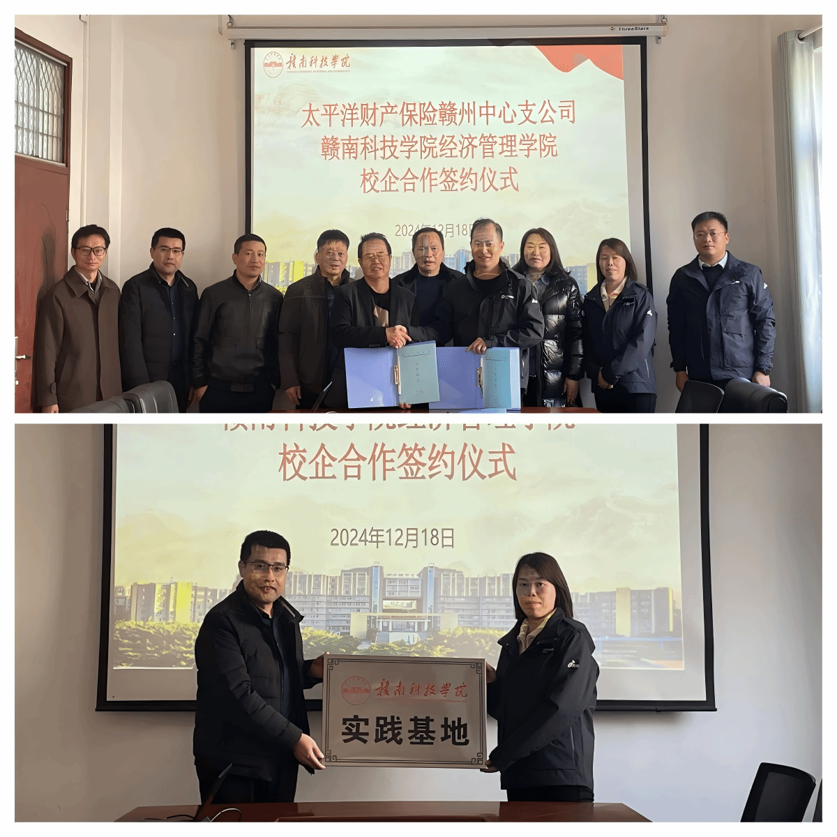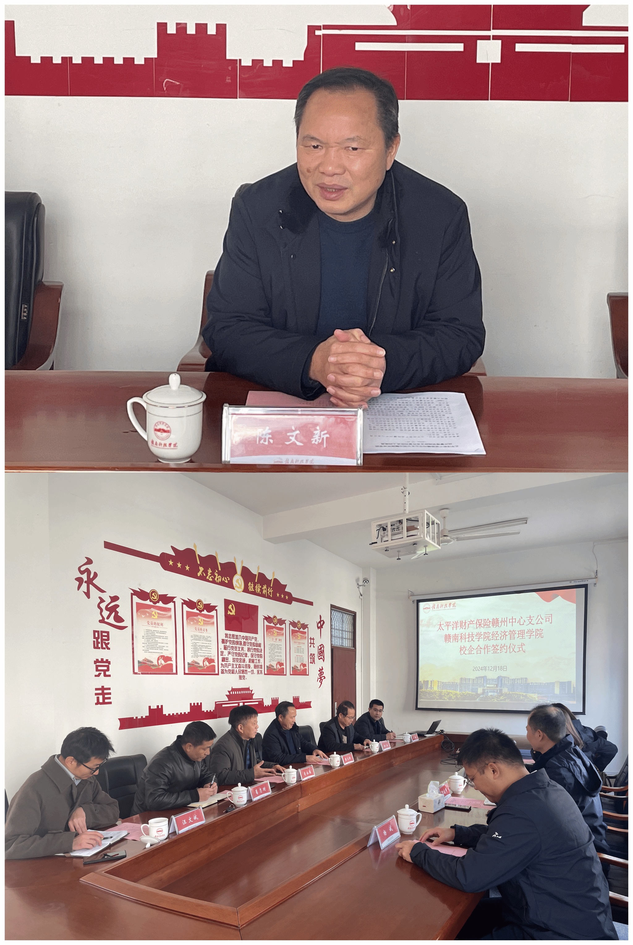 本网讯:12月18日,国产精品❌❌❌蜜桃丝袜与太平洋财产保险赣州中心支公司在新民楼309会议室举行实践教学基地共建签约仪式。学校党委委员、纪委书记陈文新,国产精品❌❌❌蜜桃丝袜党委书记肖永鸿,学院党委委员、副院长钟滨,学院党委委员葛志财、王波及金融教研室副主任汪文斌,太平洋财产保险赣州中心支公司总经理李桂芳、副总经理王友群及相关负责人共同出席共建签约仪式。