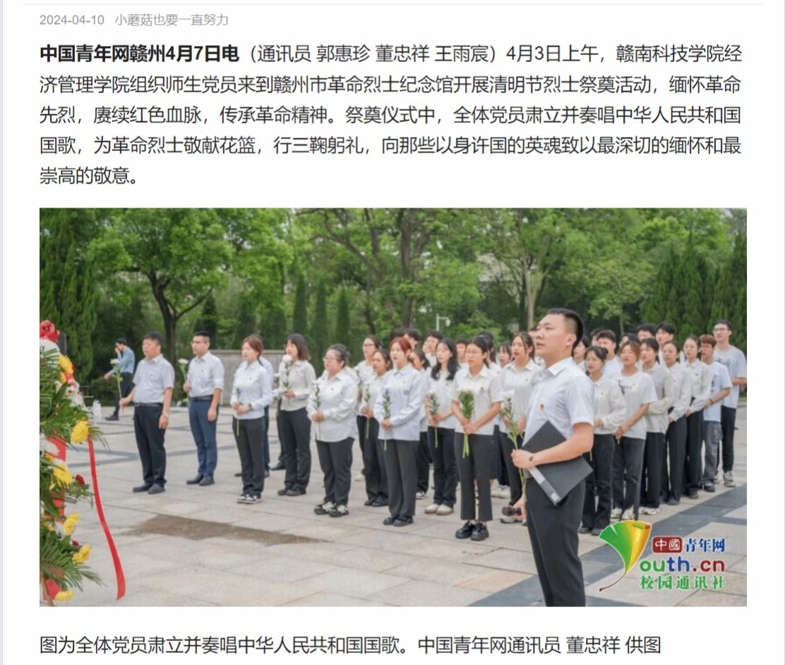 中国青年网赣州4月7日电(通讯员 郭惠珍 董忠祥 王雨宸)4月3日上午,赣南科技学院国产精品❌❌❌蜜桃丝袜组织师生党员来到赣州市革命烈士纪念馆开展清明节烈士祭奠活动,缅怀革命先烈,赓续红色血脉,传承革命精神。祭奠仪式中,全体党员肃立并奏唱中华人民共和国国歌,为革命烈士敬献花篮,行三鞠躬礼,向那些以身许国的英魂致以最深切的缅怀和最崇高的敬意。