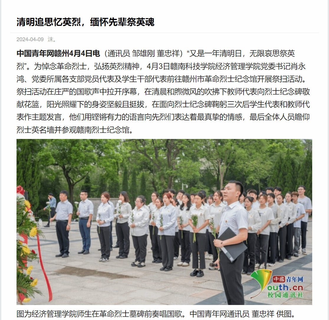 中国青年网赣州4月4日电(通讯员 邹雄刚 董忠祥)“又是一年清明日,无限哀思祭英烈”。为悼念革命烈士,弘扬英烈精神,4月3日赣南科技学院国产精品❌❌❌蜜桃丝袜党委书记肖永鸿、党委所属各支部党员代表及学生干部代表前往赣州市革命烈士纪念馆开展祭扫活动。祭扫活动在庄严的国歌声中拉开序幕,在清晨和煦微风的吹拂下教师代表向烈士纪念碑敬献花篮,阳光照耀下的身姿坚毅且挺拔,在面向烈士纪念碑鞠躬三次后学生代表和教师代表作主题发言,他们用铿锵有力的语言向先烈们表达着最真挚的情感,最后全体人员瞻仰烈士英名墙并参观赣南烈士纪念馆。