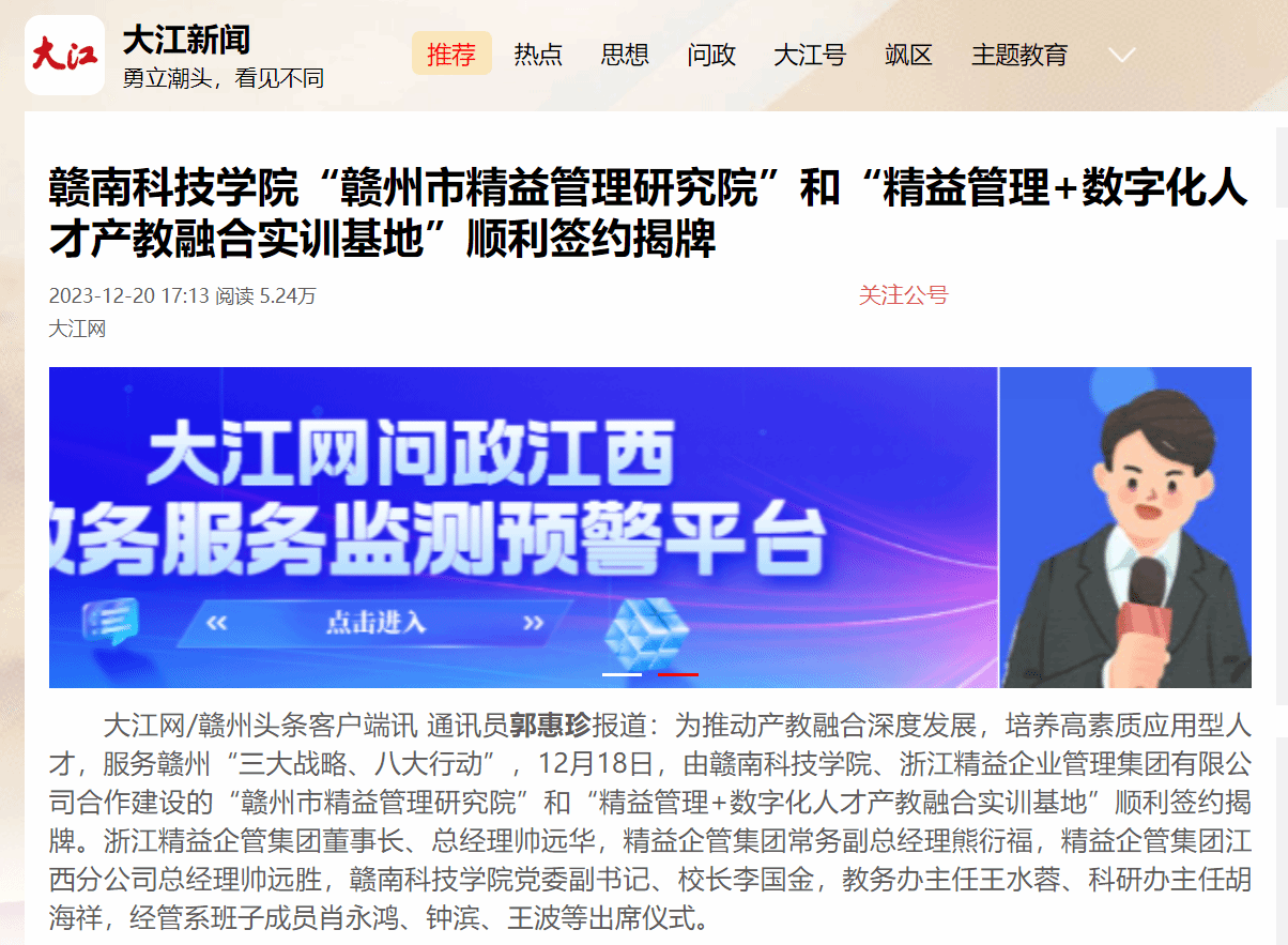 大江网/赣州头条客户端讯 通讯员郭惠珍报道:为推动产教融合深度发展,培养高素质应用型人才,服务赣州“三大战略、八大行动”,12月18日,由赣南科技学院、浙江精益企业管理集团有限公司合作建设的“赣州市精益管理研究院”和“精益管理+数字化人才产教融合实训基地”顺利签约揭牌。浙江精益企管集团董事长、总经理帅远华,精益企管集团常务副总经理熊衍福,精益企管集团江西分公司总经理帅远胜,赣南科技学院党委副书记、校长李国金,教务办主任王水蓉、科研办主任胡海祥,经管系班子成员肖永鸿、钟滨、王波等出席仪式。
