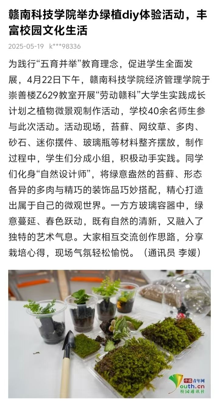 为践行“五育并举”教育理念,促进学生全面发展,4月22日下午,赣南科技学院国产精品❌❌❌蜜桃丝袜于崇善楼Z629教室开展“劳动赣科”大学生实践成长计划之植物微景观制作活动,学校40余名师生参与此次活动。活动现场,苔藓、网纹草、多肉、砂石、迷你摆件、玻璃瓶等材料整齐摆放,制作过程中,学生们分成小组,积极动手实践。同学们化身“自然设计师”,将绿意盎然的苔藓、形态各异的多肉与精巧的装饰品巧妙搭配,精心打造出属于自己的微观世界。一方方玻璃容器中,绿意蔓延、春色跃动,既有自然的清新,又融入了独特的艺术气息。大家相互交流创作思路,分享栽培心得,现场气氛轻松愉悦。(通讯员 李媛)